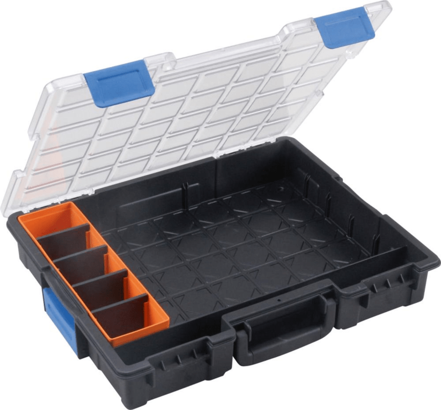 Profi-Kleinteilekoffer • Erweiterbar mit herausnehmbaren Einsatzboxen und/oder Trennstegen • Mit Klips • Mit transparentem Deckel • Fest schließend: keine Durchmischung des Inhalts • Verbindungsversc