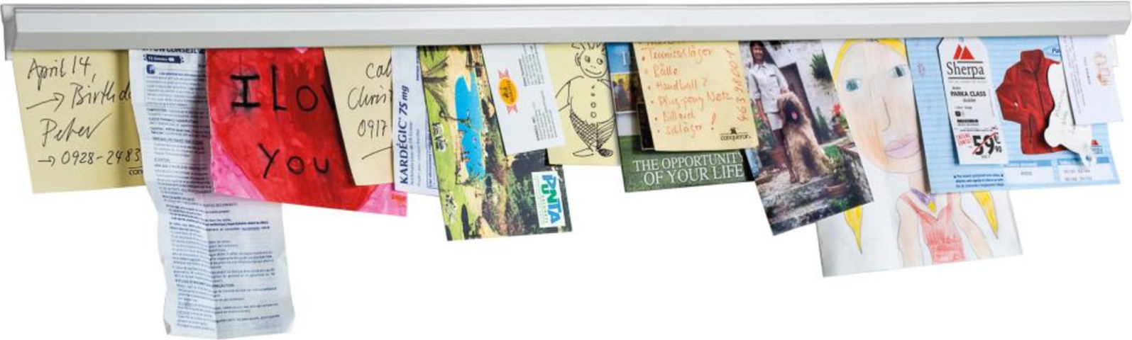 Catch Ball-Klemmleiste • Praktische Klemmschiene zum Befestigen von Notizen, Plänen, Fotos, Zeichnungen etc. • Unterlagen werden einfach von unten in die Schiene eingeklemmt • Mehrere Papiere können