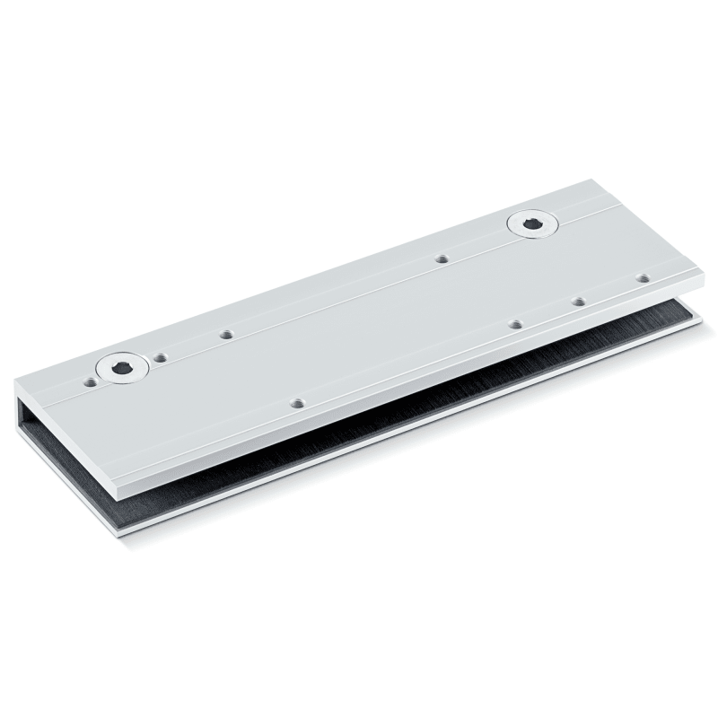 Klemmplatte für die Montage des Gleitschienen-Türschließers TS 3000 an einer Ganzglastür. • Die Klemmplatte lässt sich über die innenliegende Verzahnung auf die individuelle Glasstärke einstellen.
