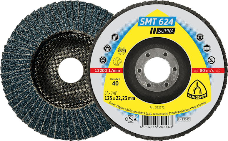 Fächerschleifscheibe SMT 624 Supra, gewölbtSchleifmopteller • Zirkonkorund • Glasgewebeteller • Für Flächenschliff und Schweißnähte auf Stahl und Edelstahl