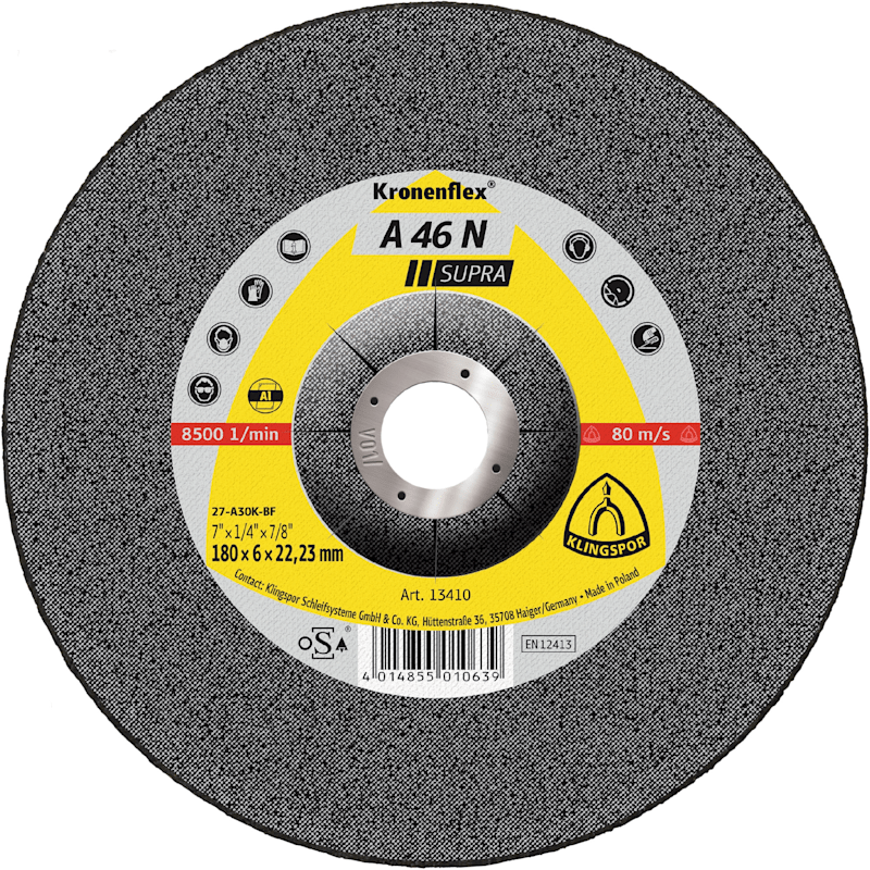Schruppscheibe A 46 N Supra für Aluminium• Hohe Schleifleistung und sehr gute Standzeit • Für die Bearbeitung von Aluminium und NE-Metallen