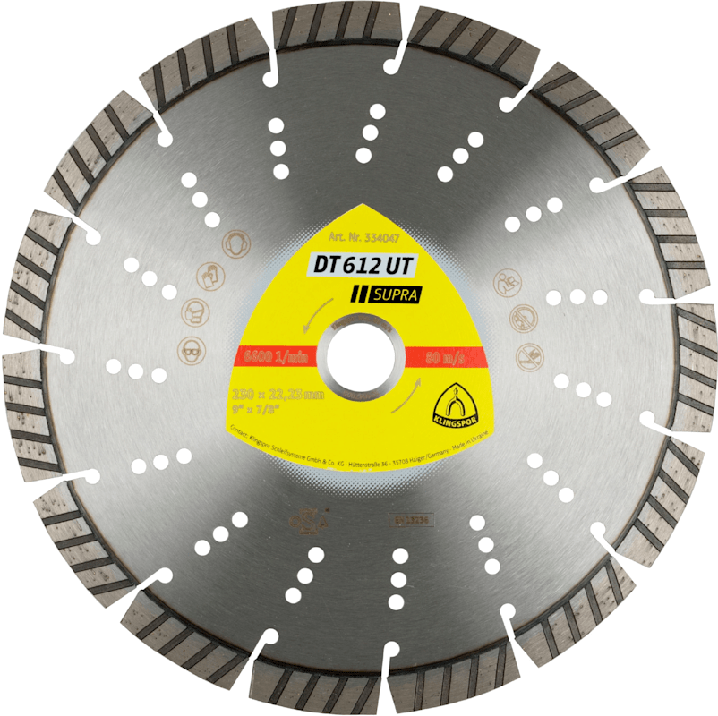 und sonstigen Baustellenmaterialien. Spezielle Turbosegmente sorgen für hohe Schnittgeschwindigkeiten bei der Bearbeitung der meisten harten Materialien.