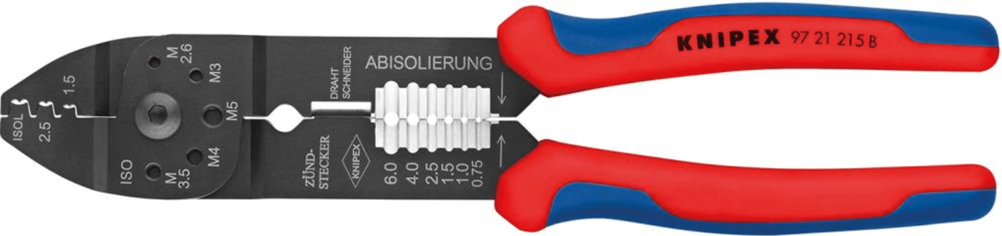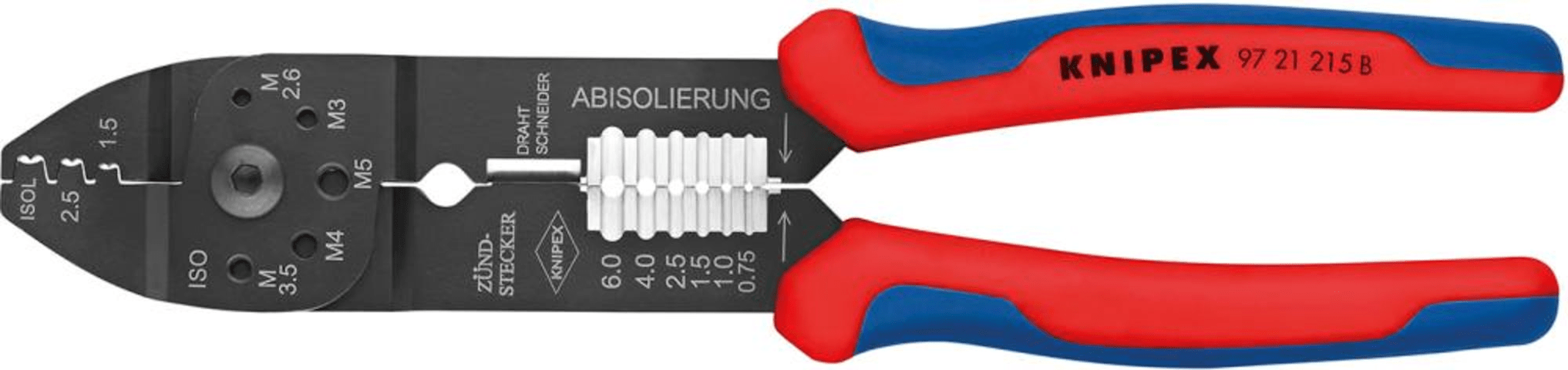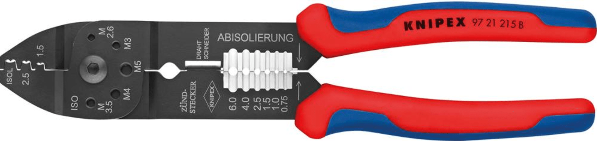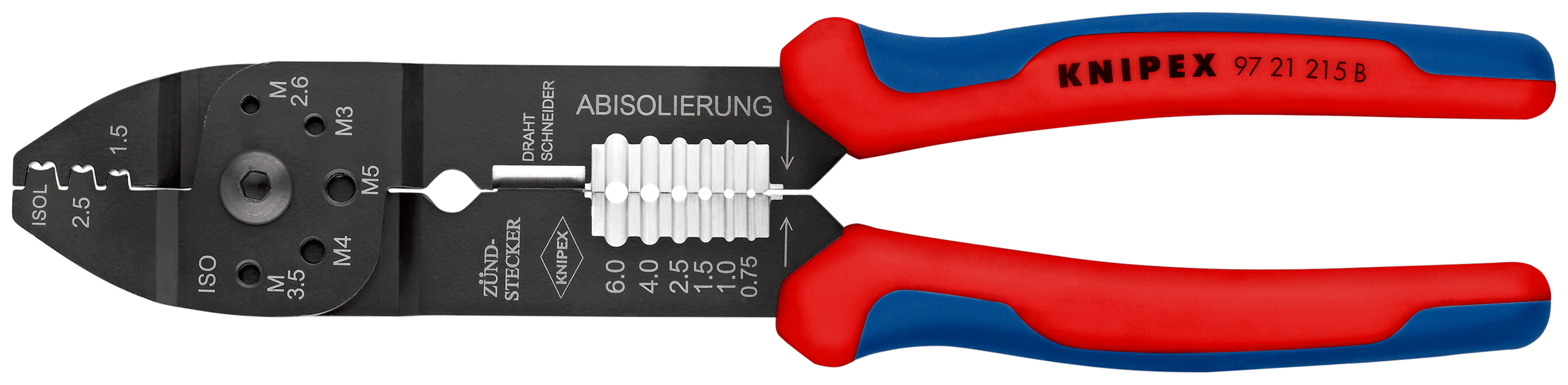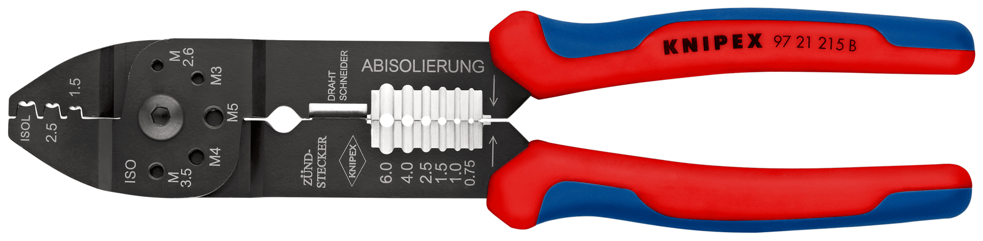 Meesenburg Artikelbezeichnung: KNIPEX CRIMPZANGE 97 21 215 B 215MM BRÜ. GRIFFE KST-HÜ.6,3MM UNIOS. OF.STECKVERB.