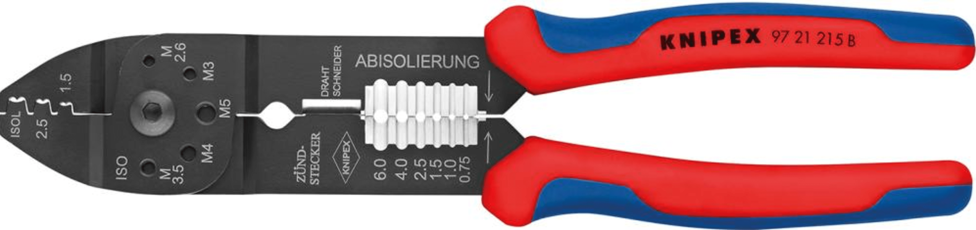 Crimpzange Nr. 97 21 215 B• Kopf lackiert • Griffe mit Mehrkomponenten-Kunststoffhüllen • Spezialstahl • Abscherfunktion für Schraubbolzen von M2,6 bis M5 und Abisolierfunktion für PVC-Leiter • Zu