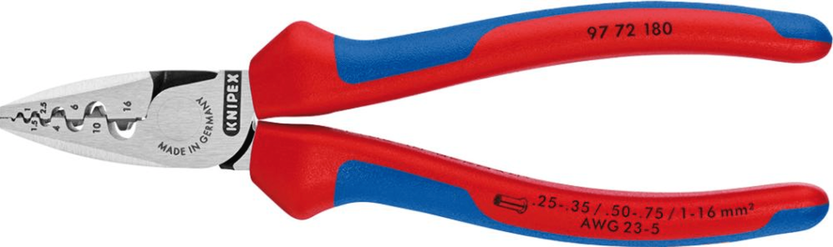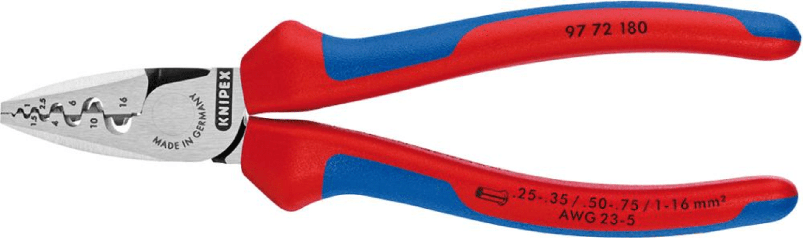 Crimpzange Nr. 97 72 180 für Aderendhülsen• Kopf poliert • Griffe mit Mehrkomponenten-Kunststoffhüllen • Spezial-Werkzeugstahl, geschmiedet, ölgehärtet • Mit 9 besonders tiefen Profilen • Für Ader