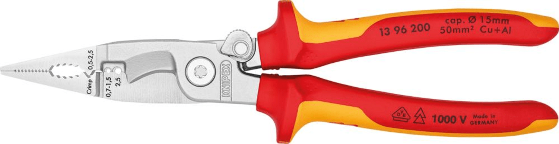 VDE-Elektro-Installationszange Nr. 13 96 200• Zange verchromt • Griffe mit Mehrkomponenten-Kunststoffhüllen • Spezial-Werkzeugstahl, geschmiedet, mehrstufig ölgehärtet • Isoliert bis 1000 V nach IE
