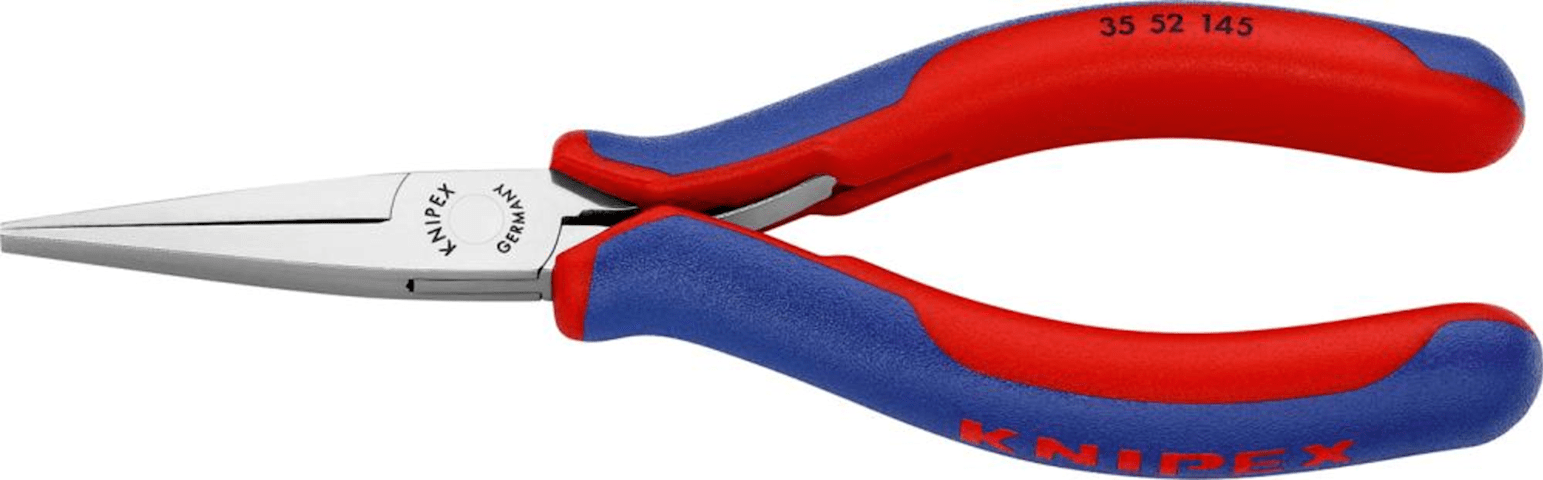 Elektronik-Greifzange Nr. 35 52 145• Kopf spiegelpoliert • Griffe mit Mehrkomponenten-Kunststoffhüllen • DIN ISO 9655 • Flachbreite Backen • Durchgestecktes Gelenk, stabil und spielfrei • Reibung
