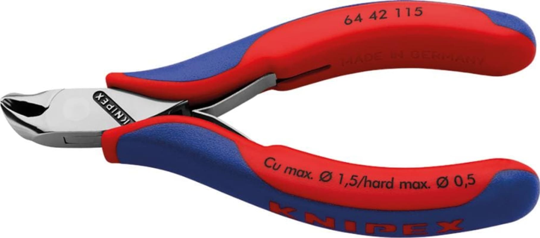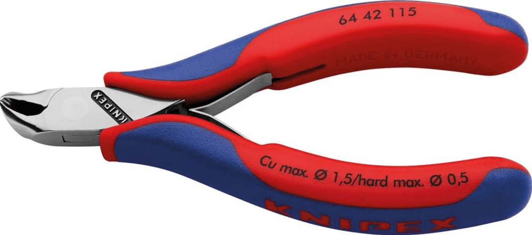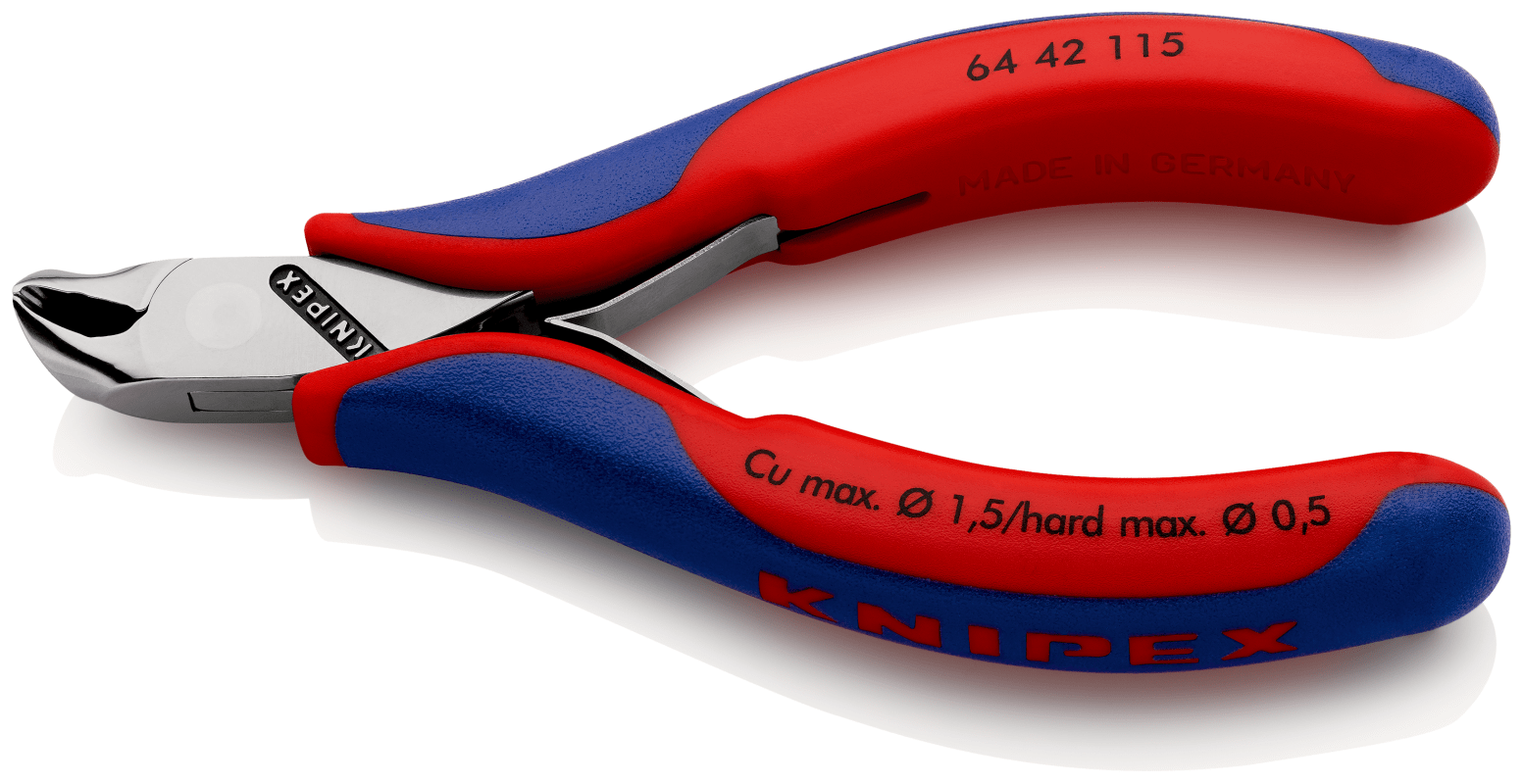 Elektronik-Vornschneider Nr. 64 42 115• Kopf spiegelpoliert • Griffe mit Mehrkomponenten-Kunststoffhüllen • DIN ISO 9654 • Durchgestecktes Gelenk, stabil und spielfrei • Reibungsarme Doppelfeder f