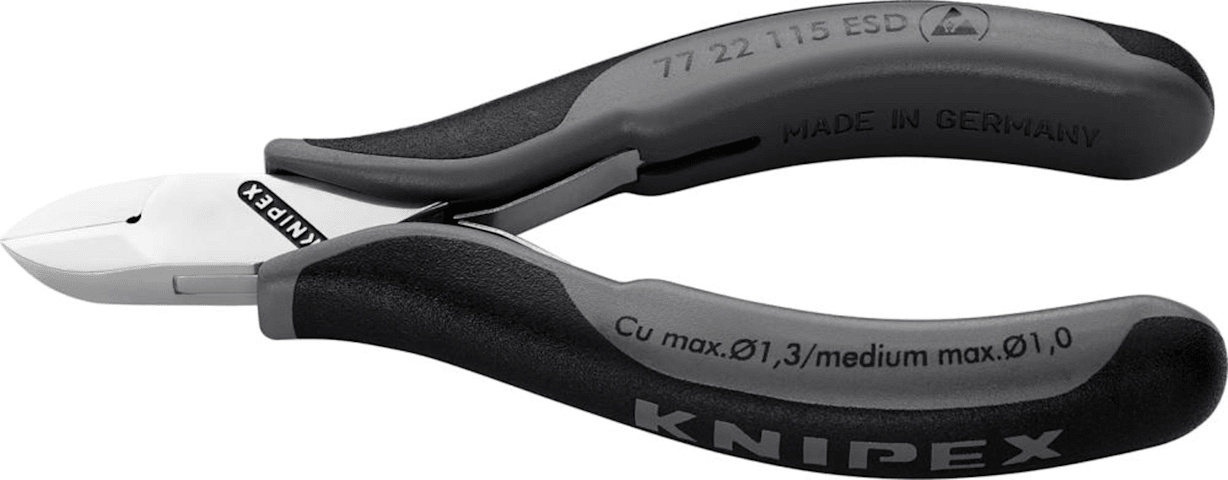 ESD-Elektronik-Seitenschneider Nr. 77 22 115• Kopf spiegelpoliert • Griffe mit Mehrkomponenten-Kunststoffhüllen • DIN ISO 9654 • Durchgestecktes Gelenk, stabil und spielfrei • Reibungsarme Doppelf