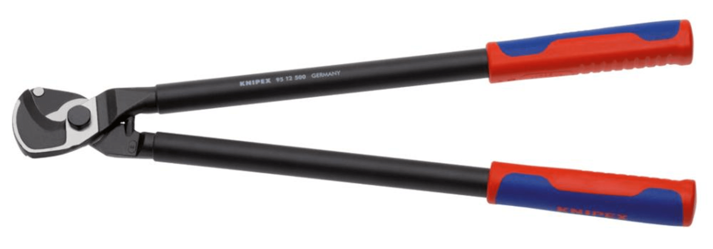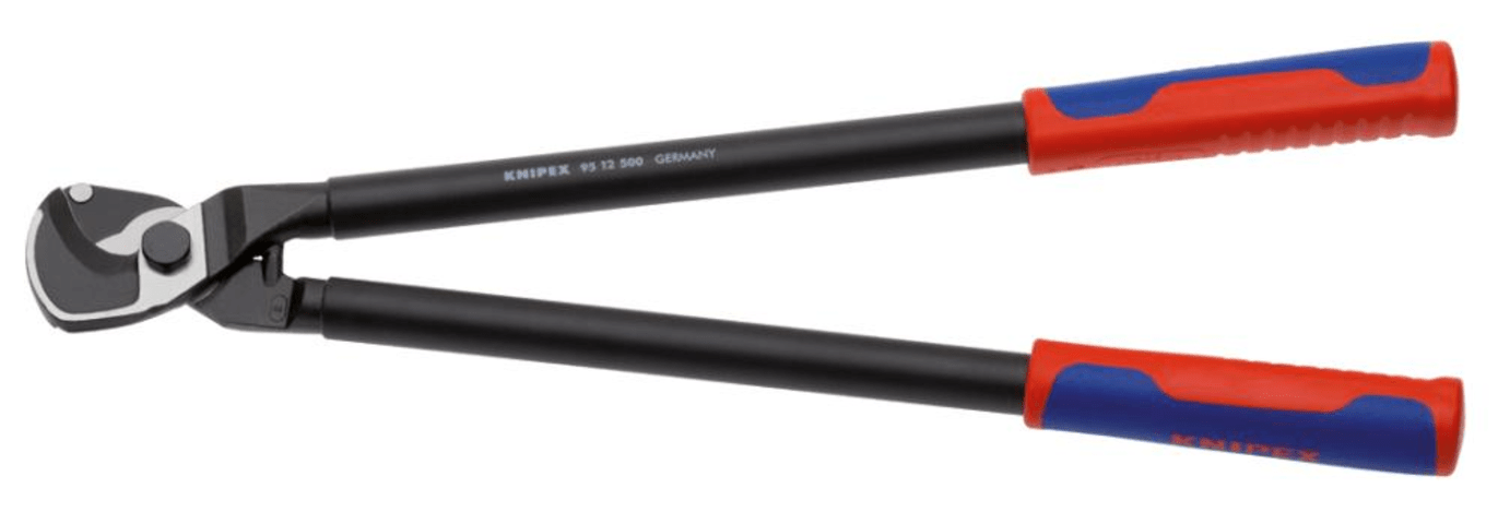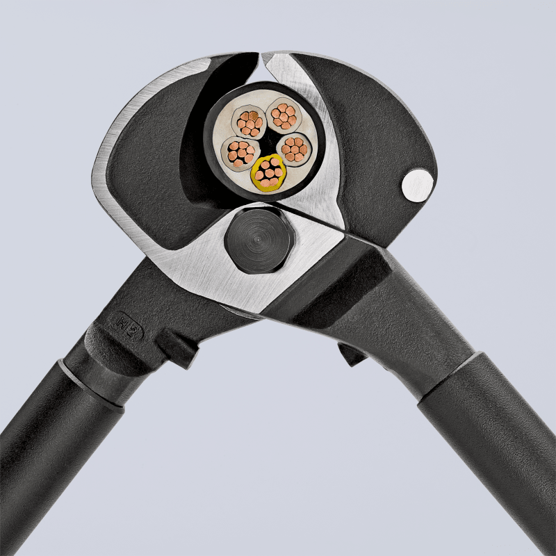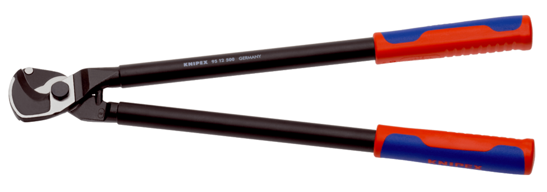 Kabelschere Nr. 95 12 500• Kopf brüniert • Griffe mit Mehrkomponenten-Kunststoffhüllen • Messerkopf aus Vanadium-Elektrostahl, geschmiedet, ölgehärtet • Schenkel aus Aluminiumrohr • Schneidet glat