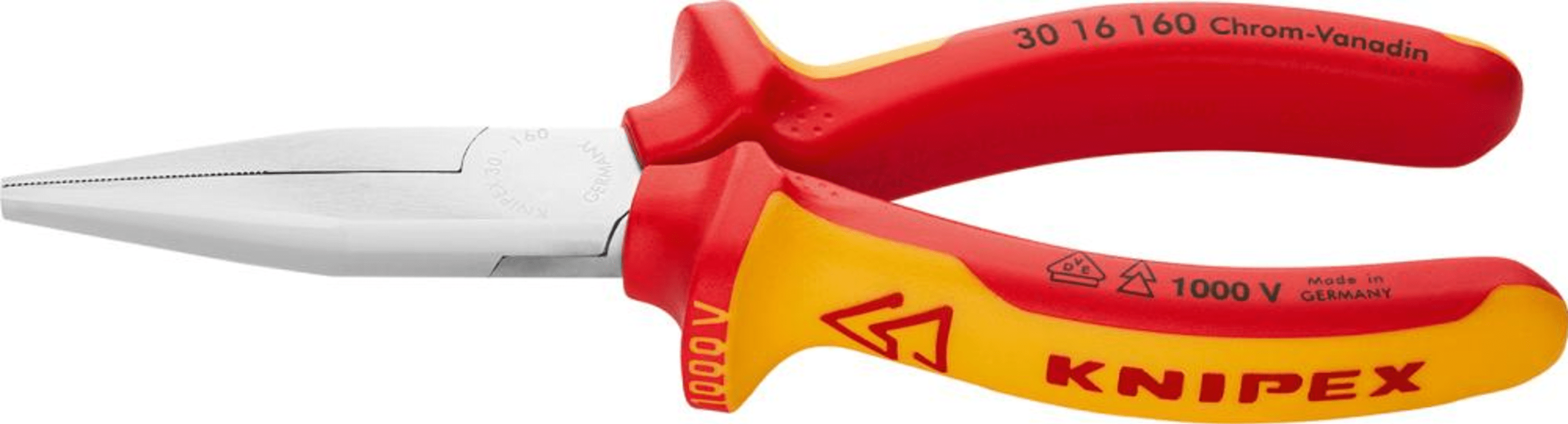VDE-Langbeckzange Nr. 30 16 160, flache Backen• Zange verchromt • Griffe mit Mehrkomponenten-Kunststoffhüllen • Chrom-Vanadium-Elektrostahl, geschmiedet, ölgehärtet • Isoliert bis 1000 V nach IEC 6