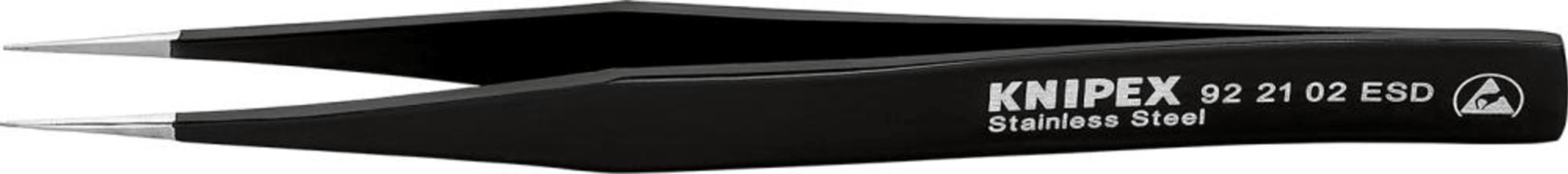 ESD-Präzisions-Pinzette Nr. 92 21 02• Spitzen gerade, spitz • Greifflächen glatt, mattiert • Oberfläche blendfrei schwarz beschichtet • Edelstahl, rostfrei, antimagnetisch • Oberflächenwiderstand