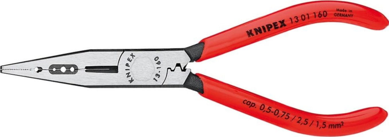 Vanadium-Elektrostahl. Lange, flache Backen. Greifflächen gezahnt. Mit Abisolierlöchern und Crimpzone. Zum Greifen, Schneiden, Biegen und Abisolieren von Drähten sowie zum Verpressen (Trapezpressung) von Aderendhülsen. Kopf poliert, Griffe mit Kunststoff-Hüllen.