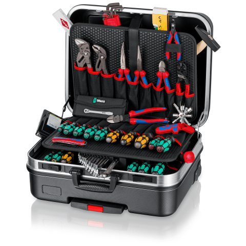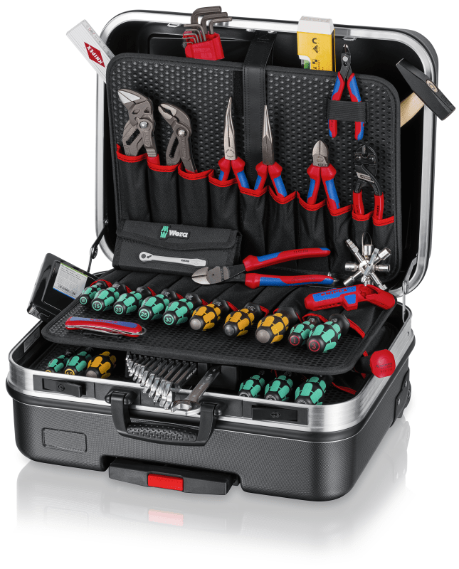 Werkzeugkoffer „BIG Basic Move“ Mechanik, 79-tlg. Mobile Profiausrüstung für Mechaniker • Bestückt mit 12 KNIPEX-Werkzeugen, insgesamt 90 Markenwerkzeugen • Im Boden eingelassener Teleskopgriff sowie zwei außen liegende, leicht laufende Skater-Rollen • Zwei Metall-Kippschlösser und ein dreistelliges Zahlencodeschloss zum sicheren Verschließen des Deckels • Beschriftungsfeld mit zwei Aufklebern zur individuellen Kennzeichnung • Max. Zuladung: 20 kg • Liter Fassungsvermögen • Stabiler, ergonomischer Tragegriff • Strapazierfähige Ausführung aus ABS-Material, schwarz • Umlaufender Aluminiumrahmen • Metallscharniere • Dokumentenfach im Deckel • Zwei herausnehmbare Werkzeugtafeln aus schmutzabweisenden PP-Hohlkammerplatten mit 31 bestückbaren Werkzeugtaschen • Bodenschale, per Druckknopf fixierbar, Höhe 70 mm, durch Einsätze weiter unterteilbar und Abdecktafel mit 14 großen Werkzeugtaschen • Insgesamt 54 Steckmöglichkeiten