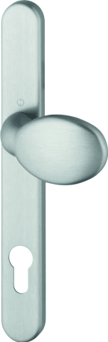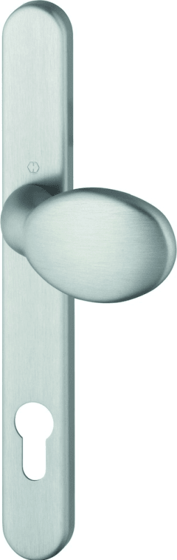HOPPE® Knopf 76G/3347N; Material: Aluminium; Befestigungsart: verdeckt verschraubt; Befestigungstechnik: mit Stütznocken; Abdeckung: auf Schmalschild; Lagerung: fest; Form Abdeckung: oval; Schildstärke: 10 mm; Einsatzbereich: Haustür; Basis: Knopf; Knopfhöhe: 50 mm; Farbton: edelstahloptik matt; Türart: Rahmentüren,Außentüren; Türwerkstoff: Aluminium,Kunststoff; Türstärke max.: 82 mm; Türstärke min.: 72 mm; Breite: 30 mm; Länge: 245 mm; Knopfform: gekröpft; DIN-Richtung: DIN Links-Rechts; Lochung: Profilzylinder gelocht; Entfernung: 92 mm; Vierkant: 8 mm; Befestigungssystem: Stiftverbindung; Knopfbreite: 90 mm; Material Unterkonstruktion: Zamak