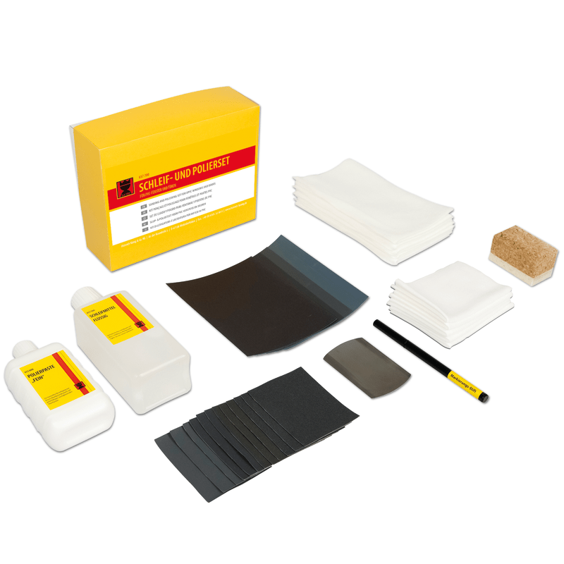 Zum Entfernen von Kratzern und leichten Verschrammungen auf durchgefärbten PVC-Profilen. Ebenfalls für abgerundete, duroplastische Kanten von Küchenarbeitsplaten geeignet. Inhalt: 1x Markierungspinsel 1x Lackziehklinge "klein", 75 x 50 mm 3x Micro-Schleifleinen, 6 x 7.5 cm, Körnung 1.800 3x Micro-Schleifleinen, 6 x 7.5 cm, Körnung 2.400 3x Micro-Schleifleinen, 6 x 7.5 cm, Körnung 3.200 3x Micro-Schleifleinen, 6 x 7.5 cm, Körnung 4.000 1x Schleifpapier nass, DIN A6, 1/4 Bogen, Körnung 280 1x Schleifpapier nass, DIN A6, 1/4 Bogen, Körnung 400 1x Schleifpapier nass, DIN A6, 1/4 Bogen, Körnung 600 1x Schleifpapier nass, DIN A6, 1/4 Bogen, Körnung 800 1x Schleifpapier nass, DIN A6, 1/4 Bogen, Körnung 1.000 1x Schleifkork mit Filzsohle 1x Trikot-Sortiment, 5 St. DIN A5 5x Wischtücher, einzeln 1x Schleifmittel flüssig, 250 ml 1x Polierpaste fein, 150 ml