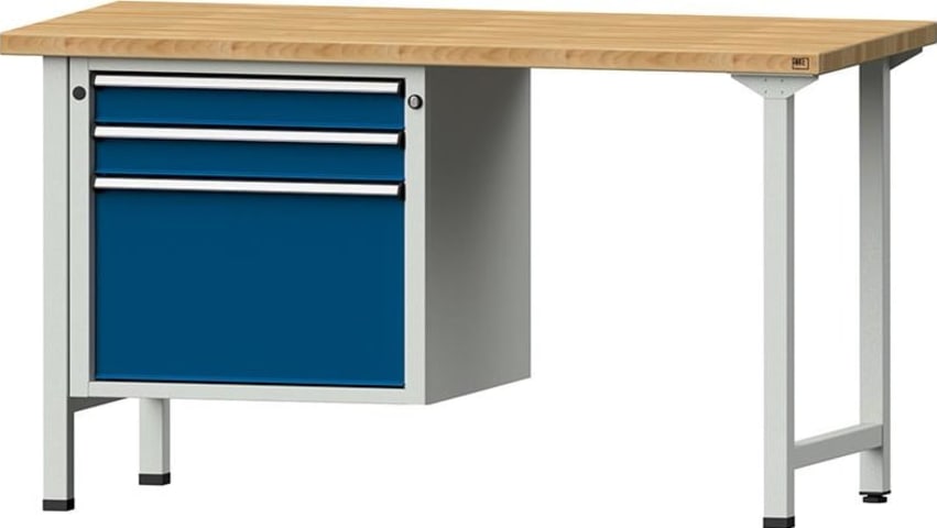 Kombiwerkbank, Serie V, mit 3 Hängeschubladen • Gesamttraglast: 800 kg • Werkbankplatte: Buche massiv, längsseits riegelartig zahnverleimt, Oberfläche geölt • Füße: 4-kant-Stahlrohr, 45/45/2 mm • S