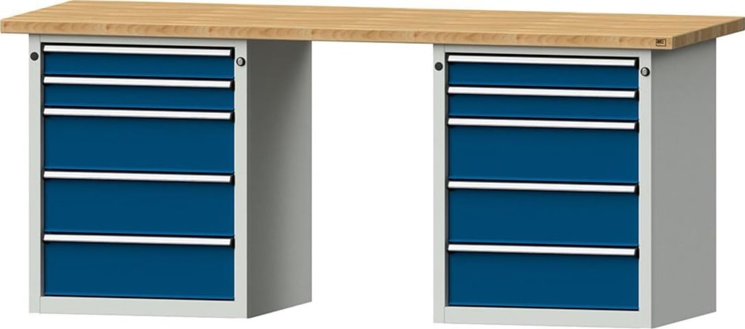 Kombiwerkbank, Serie V, mit 2 Schubladenunterschränken, 10 Schubladen • Gesamttraglast: 1000 kg • Mit 2 bodenstehenden Sockelschränken • Werkbankplatte: Buche massiv, längsseits riegelartig zahnverleimt, Oberfläche geölt • Füße: 4-kant-Stahlrohr, 45/45/2 mm • Schubladen: 4x 90 mm, 6x 180 mm, Vollauszug 100 %, Schlitzwände und Lochböden zur individuellen Unterteilung, Einzelauszugsperre • Schubladentraglast: 100 kg • Zentralverschluss • Niveauausgleich: 1 • Lackierung: Fronten RAL 5010 enzianblau, Gestell/Gehäuse RAL 7035 lichtgrau Lieferung: Komplett montiert.