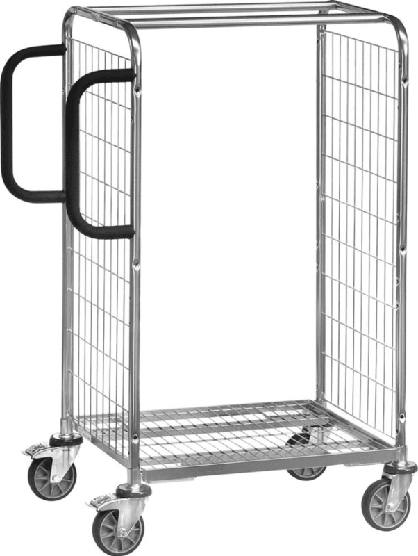 Kommissionierwagen (Grundgestell) • Stahlrohr-/Profilstahl-Konstruktion: galvanisch glanzverzinkt • Stirnwände: Stahlrohr mit eingeschweißtem Drahtgitter, Maschenweite 100 x 50 mm, versteift über 2 L