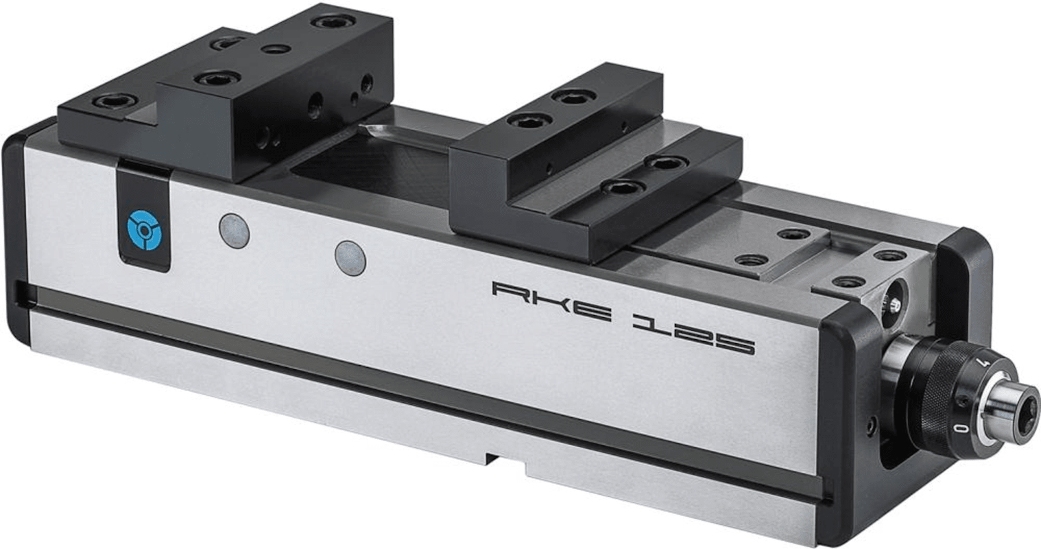 NC-Kompakt-Spanner RK • Besonders geeignet für den Einsatz auf Bearbeitungszentre • Horizontal, seitlich und in Verbindung mit einer Grundplatte vertikal aufspannbar, beispielsweise Rücken an Rücken (DUO-Aufspannturm • Stabiler Späneschutz verhindert das Eindringen von Späne • Antriebsspindel mit Spannkraftvoreinstellun • Spannfläche für Spannpratze • Zentralschmierung von Führungen und Spindelgewind • Gewinde für Winkeltriebbefestigun • Stabiler Stahl Grundkörper und alle Führungen sind allseitig gehärtet und geschliffe • Langer Spannschieber mit Quernuten, allseitig gehärtet, Funktionsflächen geschliffe • Gewindebohrungen zur Aufnahme aller RÖHM Flachspannbacken mit Backenbreite 125/160 mm