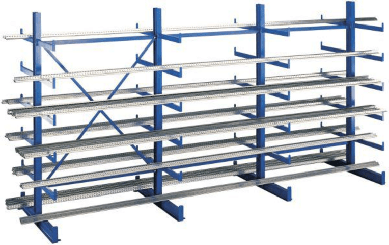 Kragarmregal K1000, zweiseitig • Ständer mit verschweißten Kragarmen • Profile warmgewalzt • Material: Stahl • Profil Ständer/Kragarme: IPE-Profil/U-Profil • Oberfläche: RAL 5010 enzianblau • Traglas