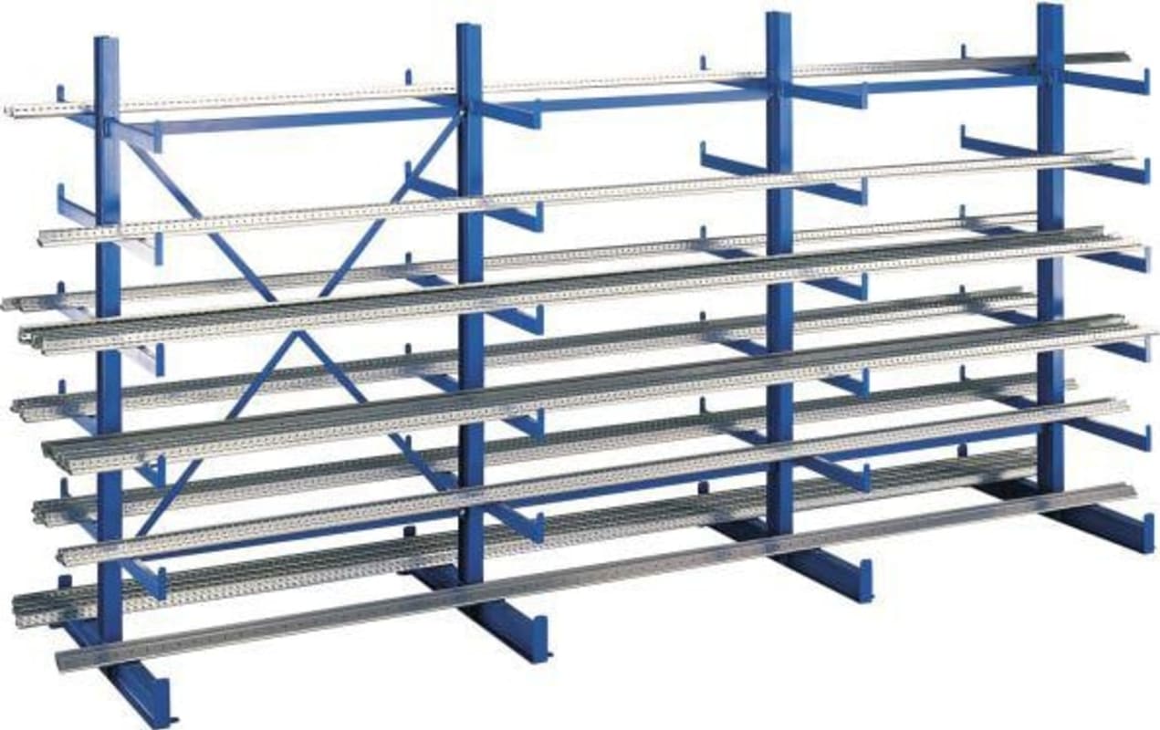 Kragarmregal K1000, zweiseitig • Ständer mit verschweißten Kragarmen • Profile warmgewalzt • Material: Stahl • Profil Ständer/Kragarme: IPE-Profil/U-Profil • Oberfläche: RAL 5010 enzianblau • Traglast Arm: 200 kg • Traglast Ständer: 1200 kg (Bei gleichmäßig verteilter Last) • Achs-Abmessung: 1250 mm • Kragarmlänge zweiseitig: 2x 500 mm • Anzahl Kragarme zweiseitig: 2x 5 • Beidseitig nutzbar Lieferung: Transportgerecht, montagefreundlich zerlegt. Inklusive Schwerlastanker zur Bodenverankerung, Aussteifungen und Befestigungsmittel.