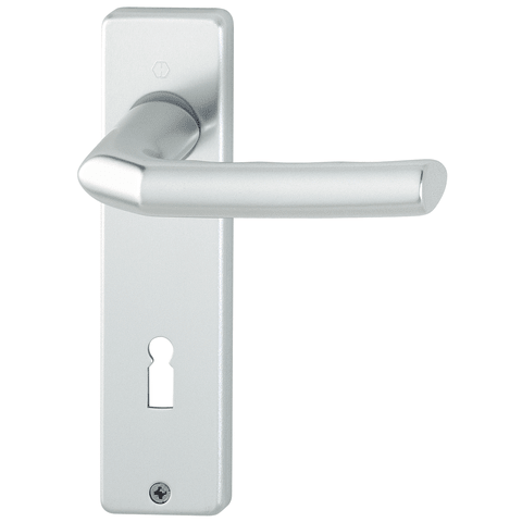 HOPPE-Aluminium-Kurzschild-Türgriff-Garnitur für Innentüren: • Lagerung: Türgriffe lose, wartungsfreie Gleitlager • Verbindung: HOPPE-Profilstift (Stift-/Lochteil) • Befestigung: sichtbar, Kunststoff-