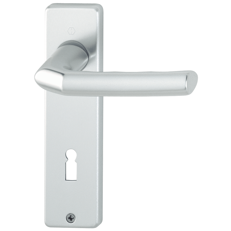 HOPPE-Aluminium-Kurzschild-Türgriff-Garnitur für Innentüren: • Lagerung: Türgriffe lose, wartungsfreie Gleitlager • Verbindung: HOPPE-Profilstift (Stift-/Lochteil) • Befestigung: sichtbar, Kunststoff-Anschlagplatten und Mehrzweckschrauben