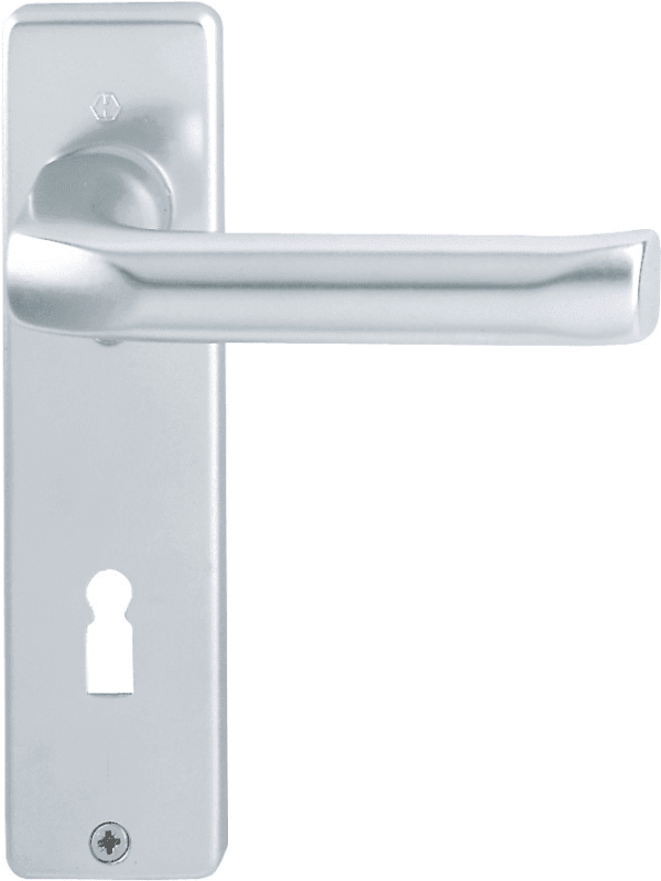 HOPPE-Aluminium-Kurzschild-Türgriff-Garnitur für Innentüren: • Lagerung: Türgriffe lose, wartungsfreie Gleitlager • Verbindung: HOPPE-Profilstift (Stift-/Lochteil) • Befestigung: sichtbar, Kunststoff-