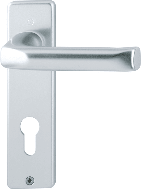 HOPPE-Aluminium-Kurzschild-Türgriff-Garnitur für Innentüren: • Lagerung: Türgriffe lose, wartungsfreie Gleitlager • Verbindung: HOPPE-Profilstift (Stift-/Lochteil) • Befestigung: sichtbar, Kunststoff-