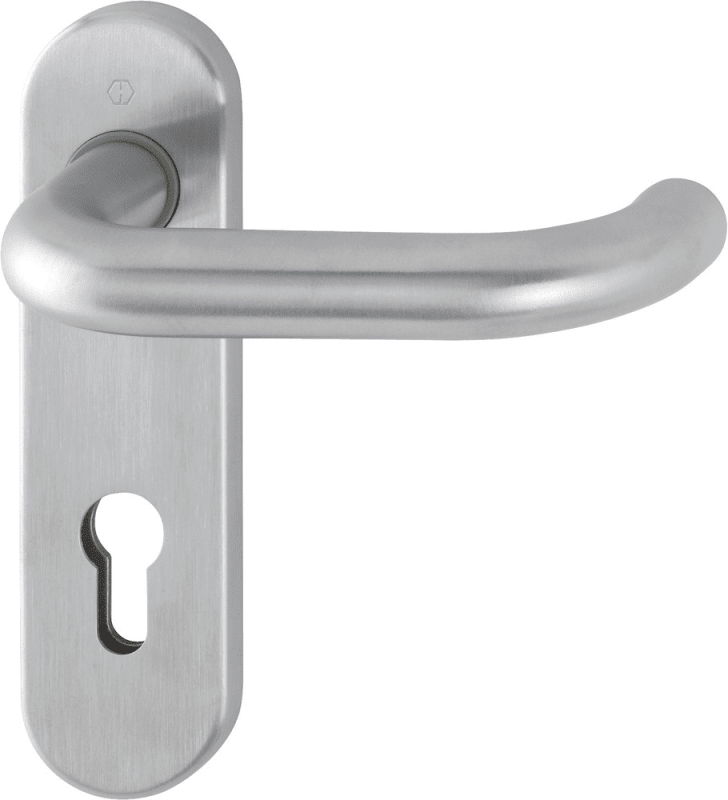 Edelstahl-Innentür-Kurzschild-Garnitur geprüft nach DIN EN 1906 (Benutzungskategorie 3). Türgriffe mit Hoppe-Schnellstift-Verbindung. Schilder mit Stahl-Unterkonstruktion und Stütznocken, aufklippbare