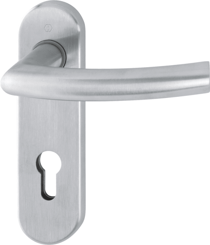 Edelstahl-Innentür-Kurzschild-Garnitur geprüft nach DIN EN 1906 (Benutzungskategorie 3). Türgriffe mit Hoppe-Schnellstift-Verbindung. Schilder mit Stahl-Unterkonstruktion und Stütznocken, aufklippbare