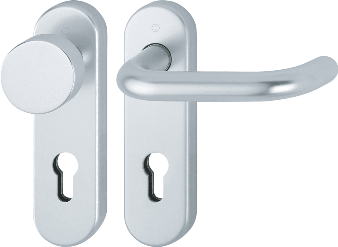 Aluminium-Kurzschild-Wechsel-Garnitur für Wohnungsabschluss-Türen Paris. • Lagerung: außen Knopf fest, innen Türgriff fest/drehbar, HOPPE-Steckgriff-Verbindung mit Kugel-Arretierung Sertos®, wartungsf