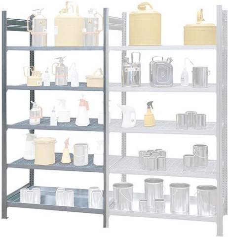 Kleingebinde-Gefahrstoffregal für brennbare Flüssigkeit• Oberfläche: verzinkt • Raster Höhenverstellung: 25 mm • Aussteifung: Traversen • Beidseitig nutzbar • GHS-Kategorie: 1–3 Lieferung: Regal