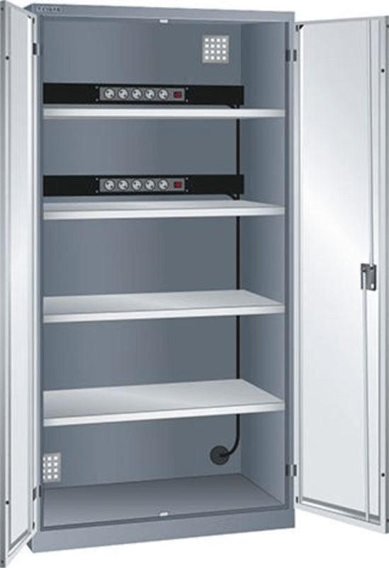 Akku-Ladeschränke mit Flügeltüren, mit Energieleiste 2x 5-fach (230 V) • Zur zentralen Versorgung von Akkus und Elektrogeräten • Mit Energieleiste 2x 5-fach (230 V) • Individuelle Konfiguration möglich: flexibler Einsatz von Schrankzubehör, Einteilungsmaterial und Elektrifizierung durch Energieleisten • Lademöglichkeiten: für akkubetriebene Elektromaschinen, Geräte zur Betriebsdatenerfassung (BDE), Notebooks, Tablets und Smartphones • Kabelmanagement: Kabelöffnungen für geschützte und geordnete Kabelführung • Montageposition Energieleisten: an Rückwand/Energiekanal, mit Ein- und Aus-Schalter • CE-konform • Sicherheit: Geräte bleiben jederzeit unter Verschluss und sind vor unerlaubtem Zugriff geschützt • Mit Vollblechflügeltüren: Scharniersystem • 4 Verstellböden: verzinkt, 30 mm stark, Tragkraft 60 kg