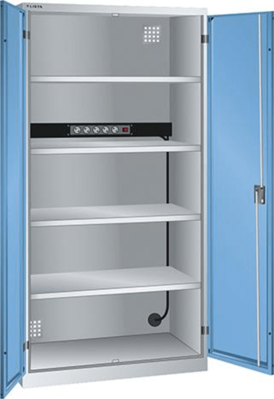 Akku-Ladeschränke mit Flügeltüren, mit Energieleiste 1x 5-fach (230 V) • Zur zentralen Versorgung von Akkus und Elektrogeräten • Mit Energieleiste 1x 5-fach (230 V) • Individuelle Konfiguration möglich: flexibler Einsatz von Schrankzubehör, Einteilungsmaterial und Elektrifizierung durch Energieleisten • Lademöglichkeiten: für akkubetriebene Elektromaschinen, Geräte zur Betriebsdatenerfassung (BDE), Notebooks, Tablets und Smartphones • Kabelmanagement: Kabelöffnungen für geschützte und geordnete Kabelführung • Montageposition Energieleisten: an Rückwand/Energiekanal, mit Ein- und Aus-Schalter • CE-konform • Sicherheit: Geräte bleiben jederzeit unter Verschluss und sind vor unerlaubtem Zugriff geschützt • Mit Vollblechflügeltüren: Scharniersystem • 4 Verstellböden: verzinkt, 30 mm stark, Tragkraft 60 kg