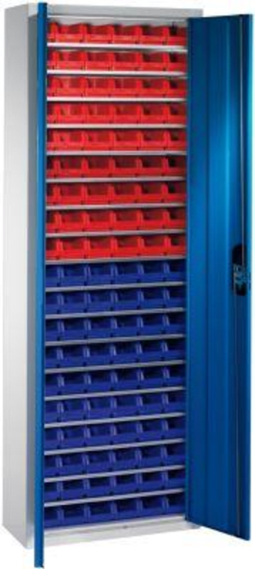 CP Lager-Regalschrank B700xT300xH1980 mm RAL 7035/5012 mit Türen 18 Fachböden, 114 Kästen