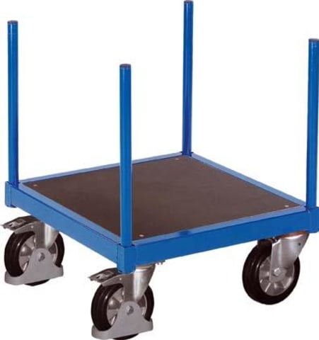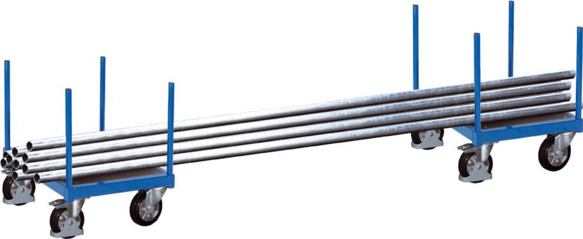 Langmaterial-Roller • Profilstahl-Konstruktion: pulverbeschichtet in RAL 5010 enzianblau • Stahlrohr-Rungen: zum Einstecken • Plattform: Sperrholz, film-/siebdruckbeschichtet (Druckoberfläche oben), wasserfest verleimt • Rollen: 4 Schwerlast-Lenkrollen, gemäß Norm Lenkrollen mit Radfeststeller und Fußschutz • Reifen: Vollgummi-Elastik-Bereifung, Ø 200 x 50 mm • Naben: Präzisions-Rillenkugellager Hinweis: Langmaterial-Roller ist für den Transport paarweise einsetzbar.