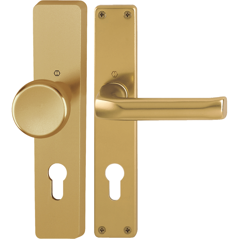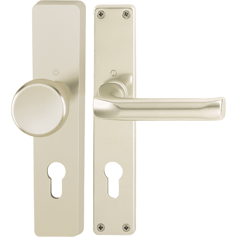 HOPPE-Aluminium-Langschild-Wechsel-Garnitur für Wohnungsabschluss-Türen: • Lagerung: außen Knopf fest, innen Türgriff lose, wartungsfreies Gleitlager • Verbindung: HOPPE-FDW-Profilstift (Lochteil) • B