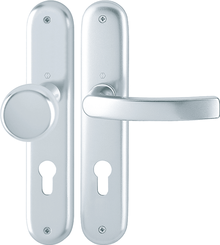 Aluminium-Innentür-Langschild-Garnitur: geprüft nach DIN EN 1906 (Benutzungskategorie 3). Türgriffe mit Hoppe-Schnellstift-Verbindung und Rückholfeder, Schilder sichtbar verschraubt.