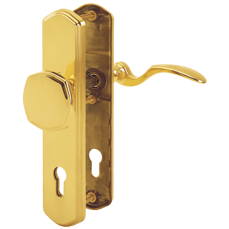 Messing-Garnitur (Wechsel-Garnitur) mit Stahlanbohrschutz: außen: gehärteter Stahlanbohrschutz im Zylinderbereich, gekröpfter, feststehender Knopf (ummontierbar); innen: loser Türgriff, HOPPE-FDW-Prof