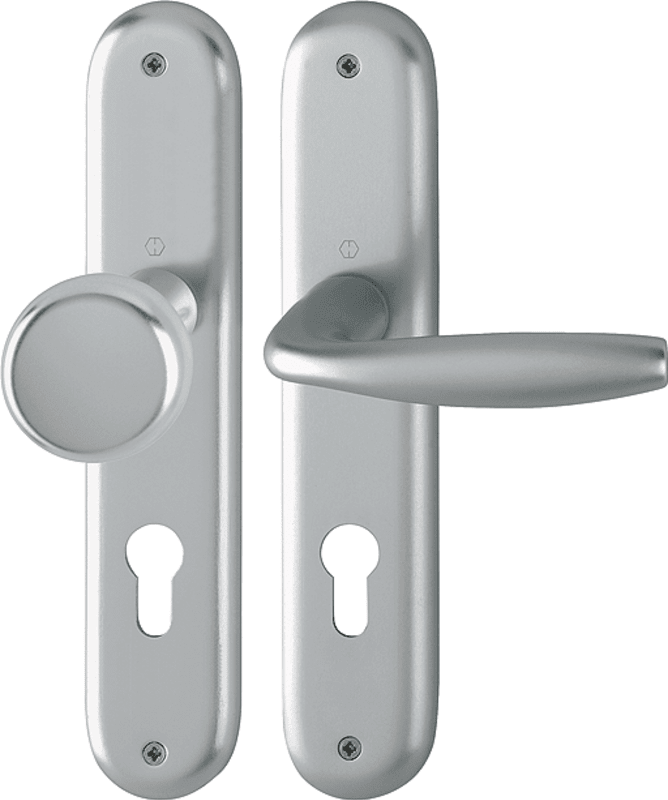 Aluminium-Innentür-Langschild-Garnitur geprüft nach DIN EN 1906 (Benutzungskategorie 3) Türgriffe mit Hoppe-Schnellstift-Verbindung und Rückholfeder, Schilder sichtbar verschraubt.