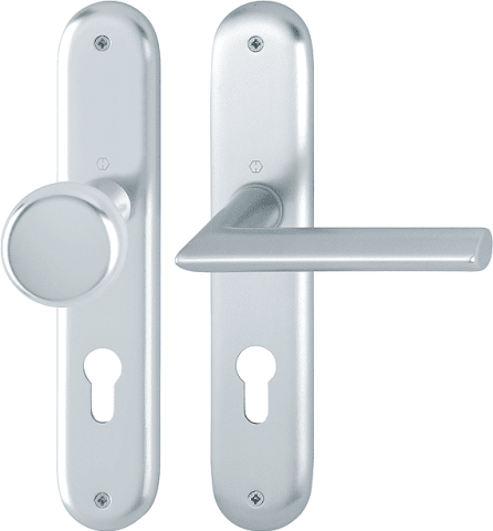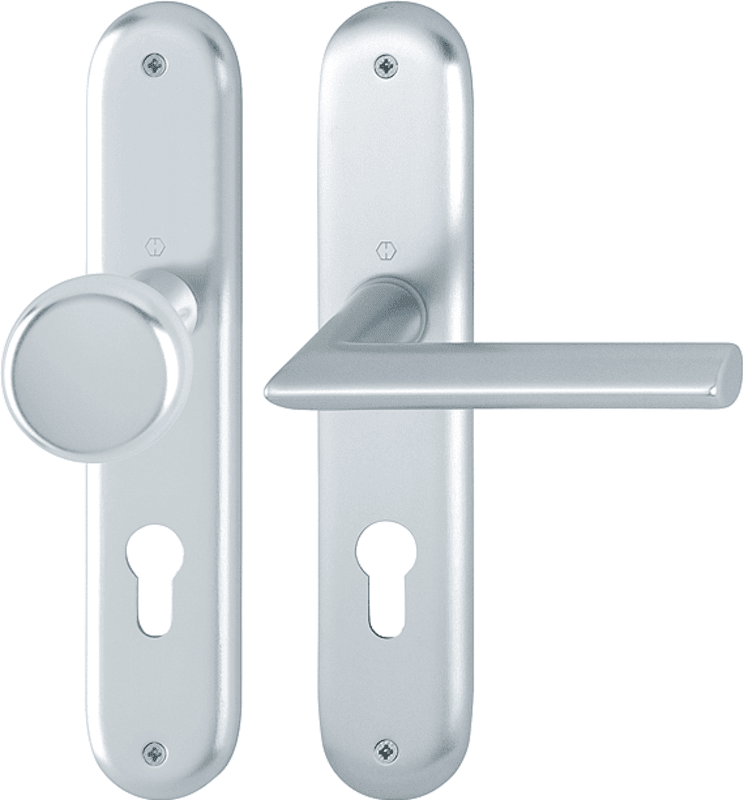 Aluminium-Innentür-Langschild-Garnitur geprüft nach DIN EN 1906 (Benutzungskategorie 3). Türgriffe mit Hoppe-Schnellstift-Verbindung und Rückholfeder, Schilder sichtbar verschraubt.