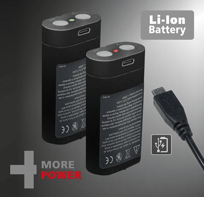 Lieferung: Mit 2 Li-Ion Akkupacks 3,7 V/5,2 Ah, Netzteil/Ladegerät 5 V/DC/2A, USB-C-Kabel, magnetischer Klemm- und Wandhalterung und Tragekoffer.