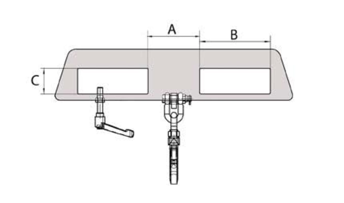 Lasthaken, 2 Einfahrtaschen • Konstruktion: stabile Stahlkonstruktion • Abrutschsicherung: auf unterschiedliche Zinkenstärken einstellbar • Wirbellasthaken: 1 Stück, zum sicheren Anschlagen der Last • Einfahrtaschen: für Gabelzinken, innen: A/B/C 160/220/80 mm Hinweis: Zur Aufnahme mit 2 Gabelzinken.