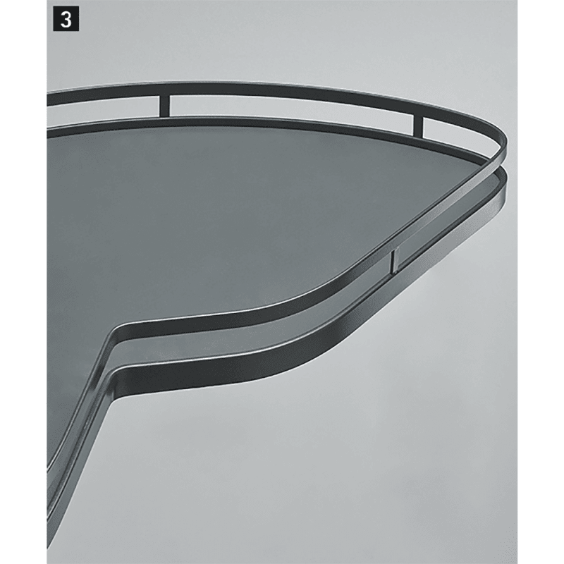 • Für vollständigen und uneingeschränkten Zugriff im Eckschrank • Die Tablare sind einzeln komplett herausschwenkbar • Lichte Mindestkorpustiefe 500 mm • Belastbarkeit 25 kg / Boden • Mit Schnellmontagesystem ClickFixx • Achse und optionale Dämpfung bitte separat bestellen • Arena Tablare Holzboden, melaminharzbeschichtet mit rutschhemmender Speziallackierung • Reling Stahl verchromt oder pulverbeschichtet • Hinweis: Für ein LeMans II Highboard sind zwei Tablar-Sets erforderlich! Set besteht aus: