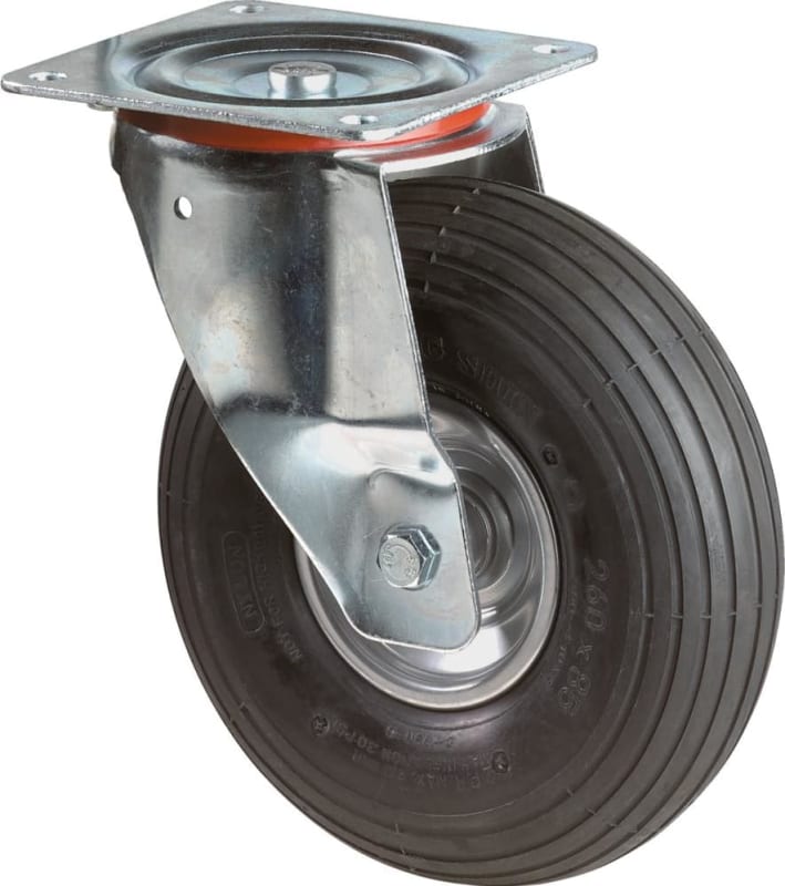 Lenkrolle • Gabel aus Stahlblech, verzinkt-chromatiert • Zweireihiger Kugelkranz im Gabelkopf • Rad: Luftbereifung schwarz, Rillenprofil • Radkörper: Stahlfelge • Rollenlager
