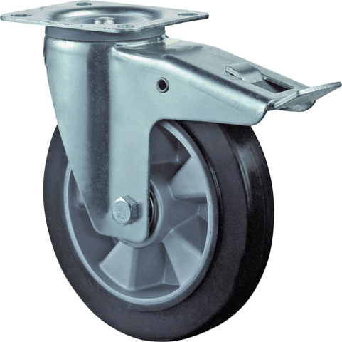Lenkrolle mit Totalfeststeller • Gabel aus Stahlblech, verzinkt-chromatiert • Zweireihiger Kugelkranz im Gabelkopf • Rad: Elastik-Reifen schwarz • Radkörper: Aluminium • Kugellager