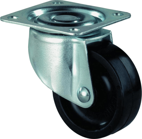 Lenkrolle • Einreihiges Kugellager im Gabelkopf • Gleitlager • Geeignet für weiche Böden • Material Gabel: Stahlblechgehäuse, verzinkt • Material Rad: Kunststoff • Farbe Rad: schwarz