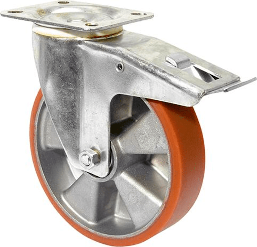 Lenkrolle, L420.B9 • Gabel aus Stahlblech, verzinkt-chromatier • Guss-Polyurethan-Reifen (95 ± 3 Shore A • Aluminium-Radkörpe • Kugellage • Mit Totalfeststeller